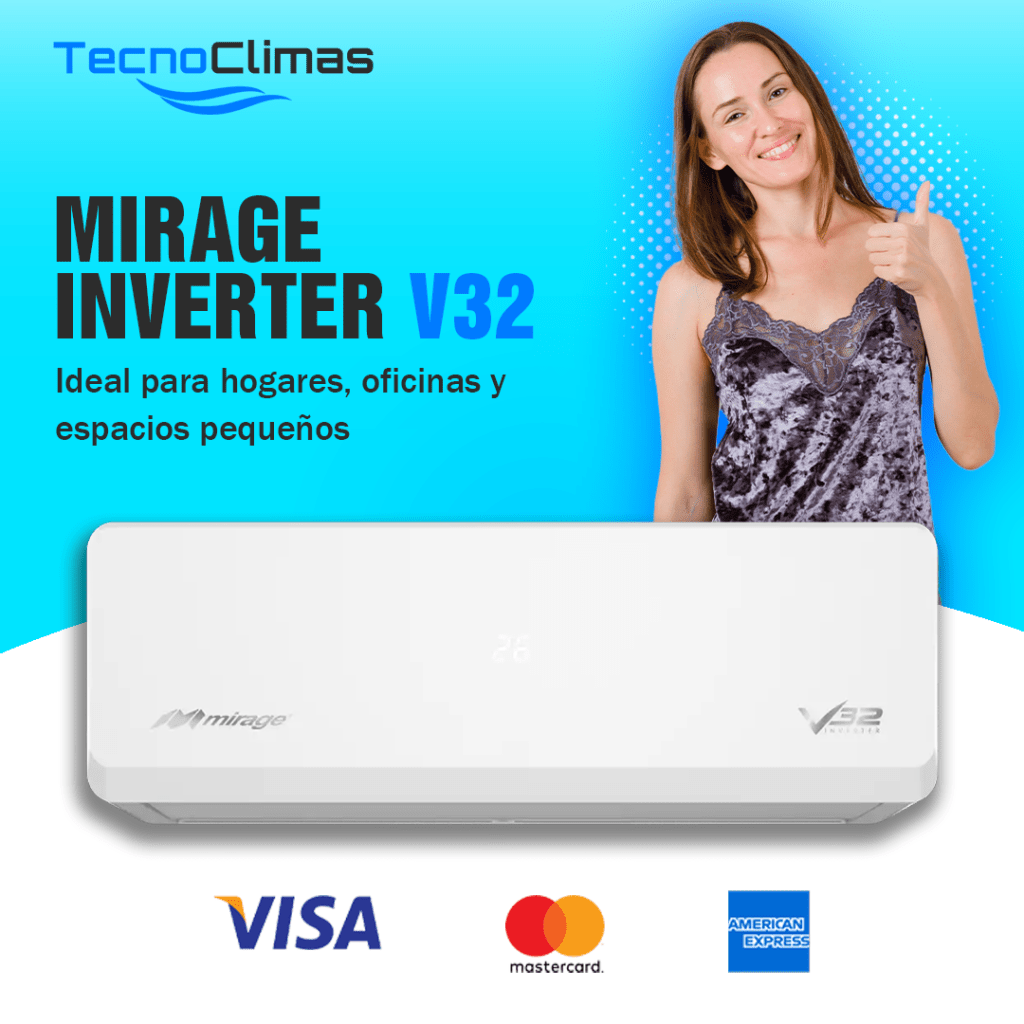 Mantén tu hogar fresco con el Mirage V32 Inverter. Con tecnología de alta eficiencia energética y refrigerante R32, este minisplit te ofrece mayor confort con menor consumo eléctrico.
